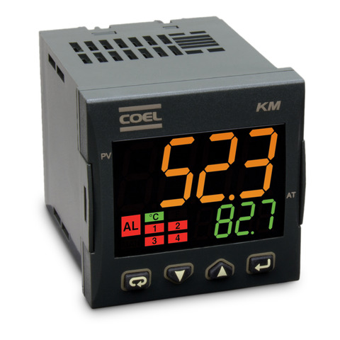 O KM5P é um controlador de temperatura e processo, com a função rampa e patamar de 2 páginas com 48 segmentos dividido em 8 programas. Possui uma entrada universal (Termopar (J, K, R, S, T), mV, V, mA, Pt100). 2 saídas pulso, 2 saídas relé, comunicação serial TTL MODBUS. Alimentação 24VCA/VCC.