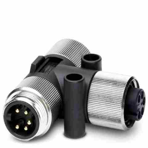 Distribuidor T, 5-pólos, Conector reto 7/8″-16UNF, para Soquete reto 7/8″-16UNF e Soquete reto 7/8″-16UNF, distribuidor paralelo.